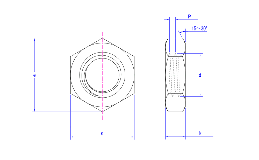 | Mga katangian ng hitsura | Hugis: hexagonal na may anim na simetriko na panig, na nagpapahintulot para sa madaling paghigpit at pag -alis gamit ang isang wrench o iba pang mga tool. Ang disenyo na ito ay nagbibigay ng mas mahusay na kaginhawaan sa pagpapatakbo sa mga nakakulong na puwang. Kapal: Kumpara sa karaniwang mga hex nuts, ito ay mas payat, inuri bilang isang manipis na nut. Ito ay medyo magaan at sumasakop ng mas kaunting puwang. Paggamot sa ibabaw: Karaniwan ay nagpapanatili ng natural na hindi kinakalawang na kulay na bakal na may isang metal na kinang. Maaari rin itong sumailalim sa passivation, polishing, o iba pang mga paggamot sa ibabaw kung kinakailangan upang mapahusay ang paglaban ng kaagnasan at aesthetics. |