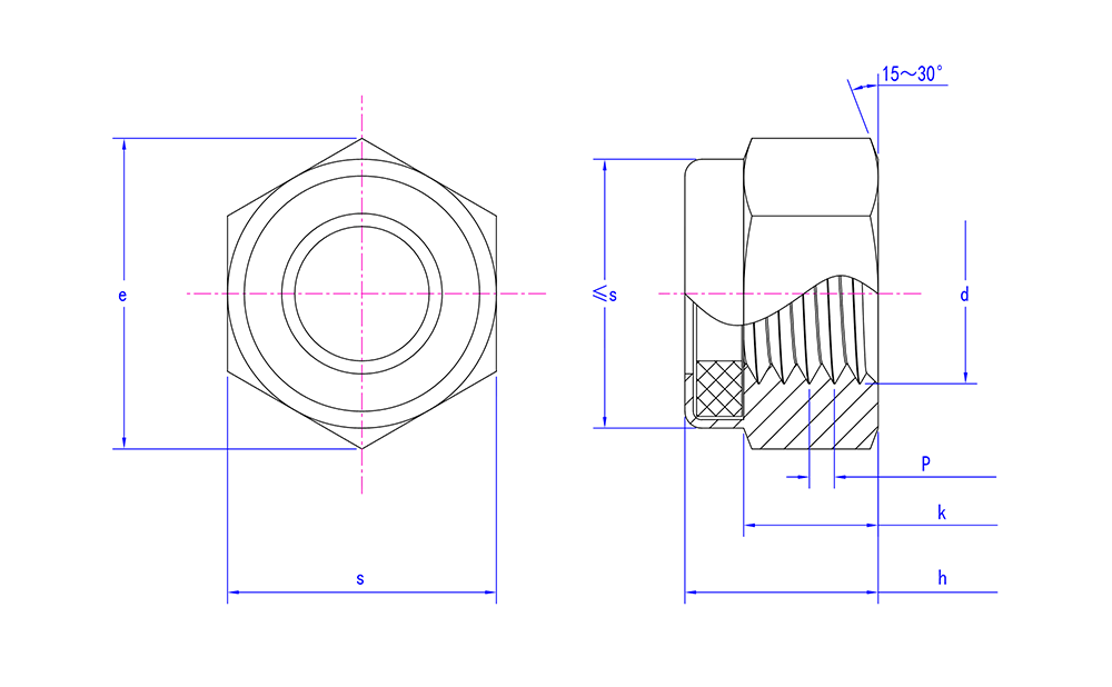 | Panloob na mga tampok | Panloob na may mga pagsingit na materyal na hindi metal, tulad ng mga singsing ng naylon, upang mapahusay ang friction at lakas ng pag-lock |